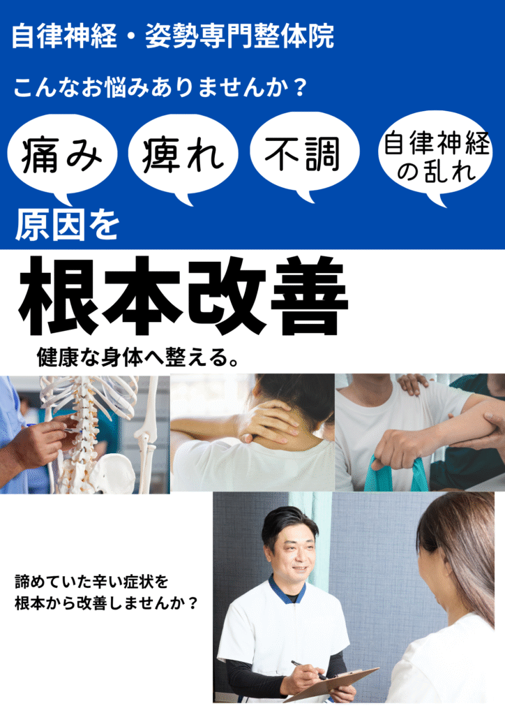 当院独自の神経系統合理論に基づき、自律神経の乱れと姿勢悪化の悪循環を断ち切り、相乗効果で根本改善を図ります。